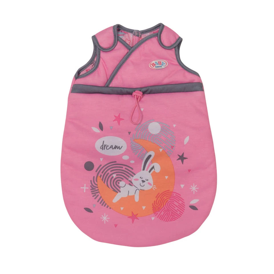 Je BABY born pop is net als een echte baby. Je voedt haar, verzorgt haar en kleedt haar. Kijk eens naar de tijd. Het is bedtijd, dus je kleed je baby in deze BABY born slaapzak. De knusse slaapzak zorgt ervoor dat slapen een ware lust is. Op de slaapzak zie je Benno het konijn, die een plekje heeft gevonden op de maan. De grijze naden maken de slaapzak tot een mooie blikvanger. Je kunt je baby gemakkelijk in de slaapzak leggen of er later weer uit halen dankzij de handige klittenbandsluiting op de schouderbanden.