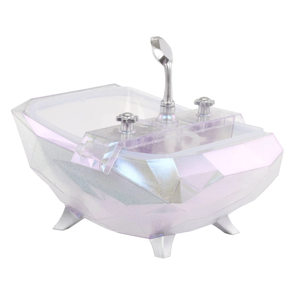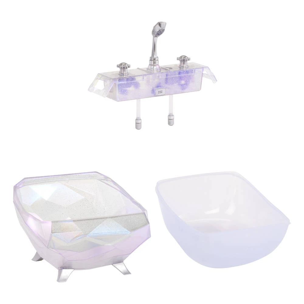 Volg de glinstering tot aan de zonsondergang en sla linksaf bij de maan om de magische wereld van de Glitter Babyz te ontdekken. Badderen is altijd magisch met de Glitter Babyz bruisende badkuip met kleurverandering! Stop je Glitter Babyz en eenhoorns in bad om hun magie levend en sprankelend te houden. Deze magische badkuip verandert van kleur met koud water, produceert badschuim en heeft een echt werkende douchekop. Het binnenbad is verwijderbaar en daarom makkelijk schoon te maken.
