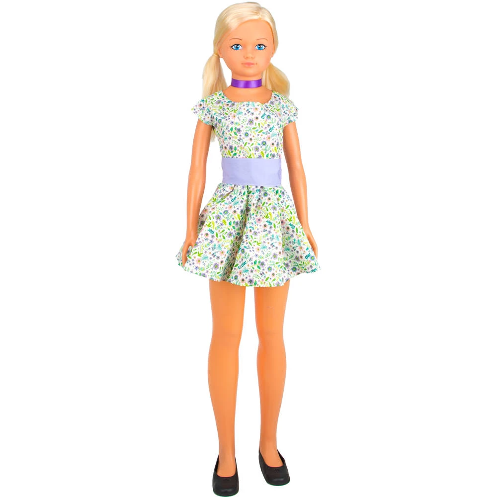 Met deze pop zal je het nooit meer saai hebben. Kleed haar mooi aan en kam haar haar. Deze pop draagt een superschattige bloemetjesjurk en is 105 cm groot.