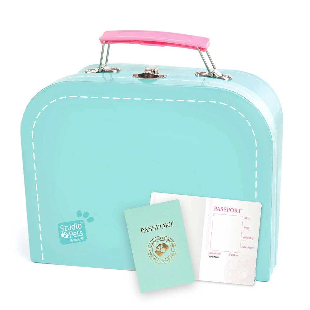 Deze prachtige turquoise koffer is uitermate geschikt voor een Studio Pets knuffel van 16 cm. Op die manier kan je je favoriete knuffel gemakkelijk overal mee naar toe nemen. De koffer wordt geleverd met een blanco paspoort speciaal voor jouw knuffel. Het koffertje is gemaakt van hoge kwaliteit karton.
