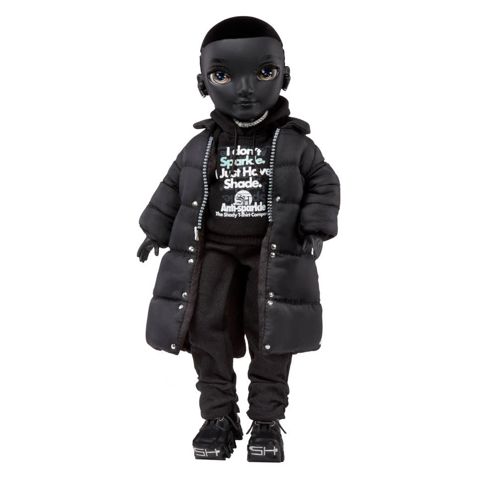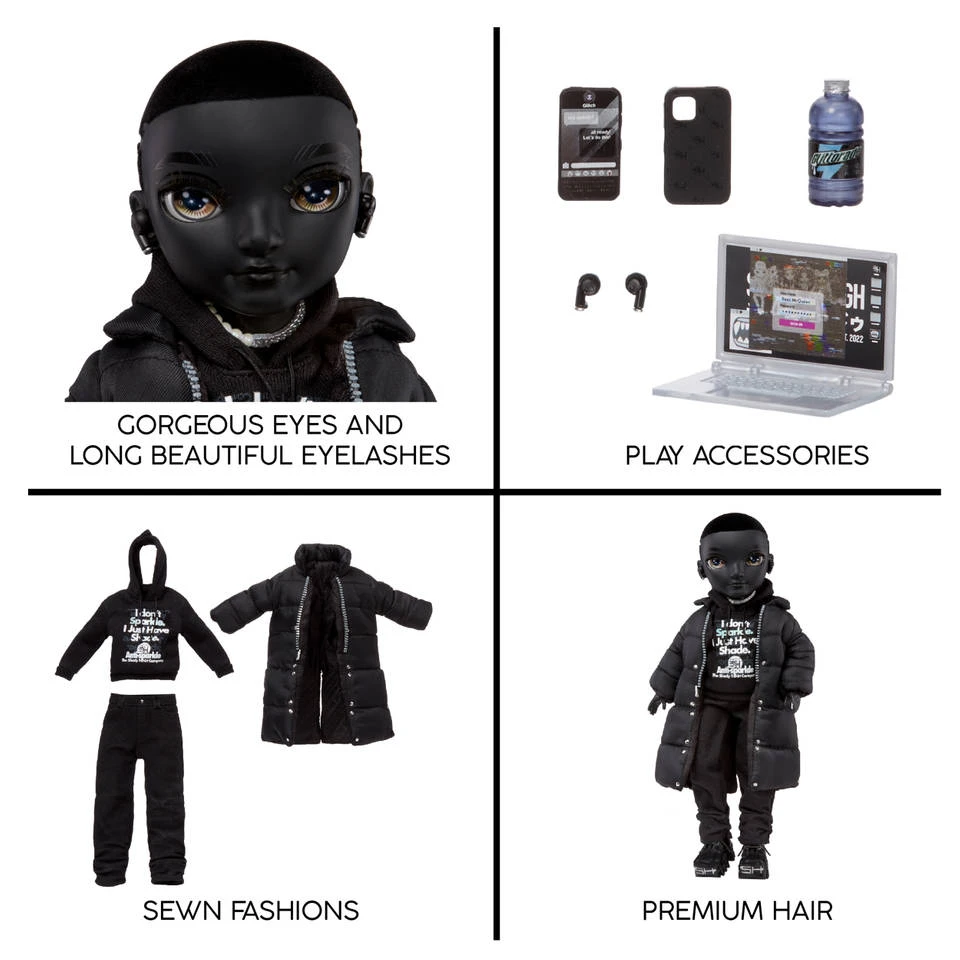 Rainbow High moedigt creativiteit aan, viert diversiteit en omarmt inclusiviteit. Rainbow High en Shadow High laten als vrienden samen hun ware kleuren schitterende zien. Rexx draagt een zwart-zilveren pufferjack, bedrukte zwart-witte hoodie, zwarte denim, SH-sneakers en accessoires. Hij heeft zwart haar, lange wimpers en glazen ogen.